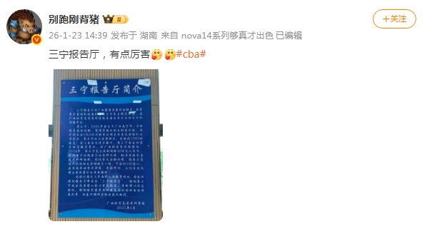 北京时间1月30日,根据媒体人别跑刚背猪报道,北控男篮国手辽宁三宁早在2024年,曾经给母校广西体育高等专科学校捐款30万元,用于装修工程修建报告厅,并且被命名为“三宁报告厅”。